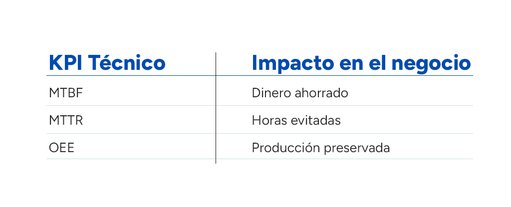 Los KPI de mantenimiento clásicos (MTBF, MTTR, OEE, disponibilidad) son importantes. Pero a los directores financieros no les impresiona la idea de «mejoramos el MTBF en un 15%».